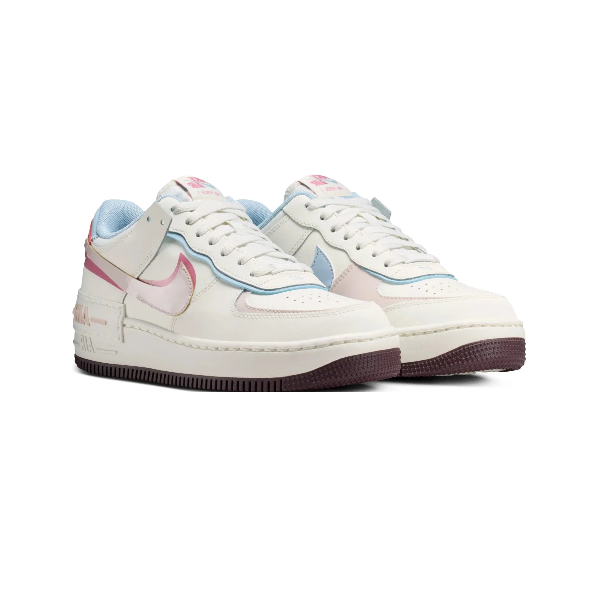 The Nike Air Force 1 Shadow is defined by its signature doubled aesthetic, featuring layered eyestays, mudguards, heel tabs, and Swooshes that create depth and visual impact without straying from the original design language. The 'White Pink Blue' colorway balances a crisp leather upper with subtle pastel accents, resulting in a look that is both understated and expressive. A slightly elevated midsole adds a platform feel while maintaining the comfort expected from the Air Force 1 line, supported by encapsulated Nike Air cushioning for all-day wear. Durable rubber outsoles with classic pivot points ensure reliable traction, making the sneaker as functional as it is stylish.